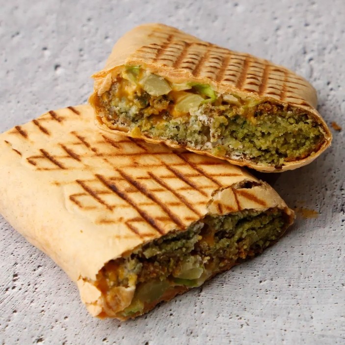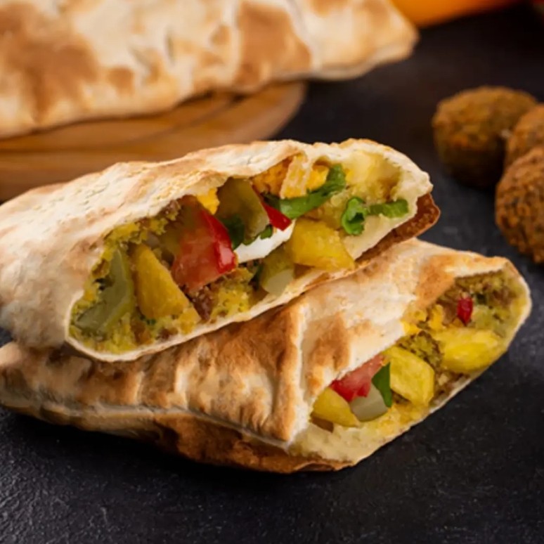 عجين فطير يحتوي علي فلافل مقرمشة + بطاطس فرنساوي مقرمشة + مبشور الطماطم +ملفوف فريش مبشور + ويقدم ساخن وشهي ذات مذاق خاص بمطعمنا