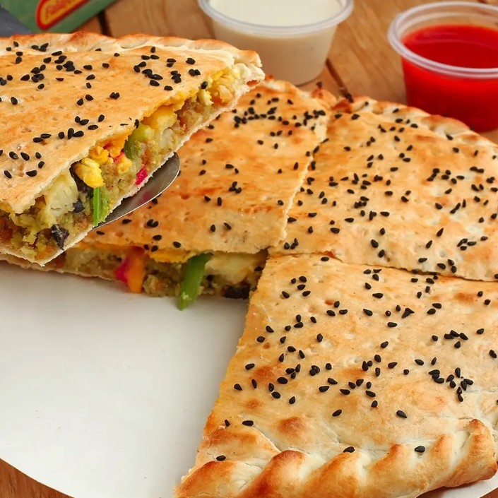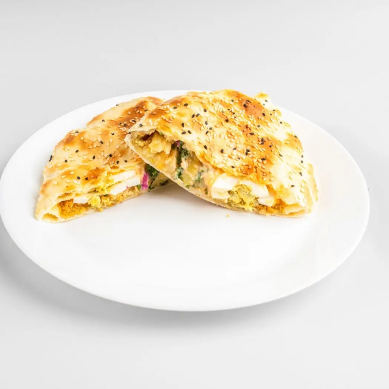 عجين فطير يحتوي علي فلافل مقرمشة +جبن+بيض مبهر + مبشور خس ويقدم ساخن وشهي ذات مذاق خاص بمطعمنا